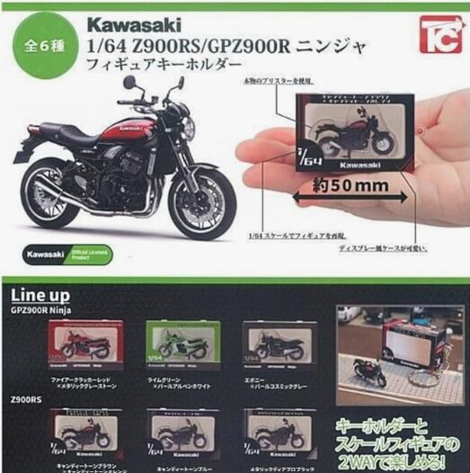トイズキャビンが展開する1/64スケールケース入りキーホルダーシリーズの最新弾は、Kawasakiの名車2モデルを収録した全6種構成。全長約50mmというコンパクトサイズながら、塗装・造形ともに高水準を狙った仕様です。