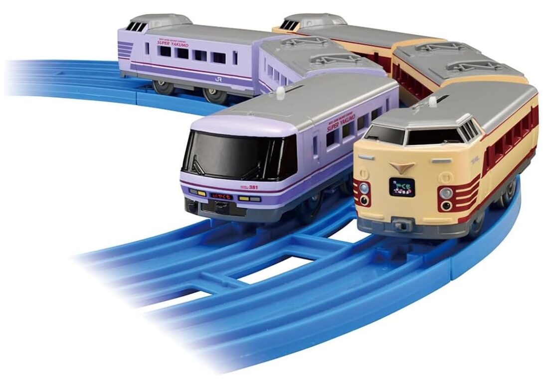 本商品は、1982年の営業運転開始から昭和・平成・令和の3時代を走り抜け、2025年1月に運用終了した381系特急やくもを記念したプラレールです。タイトルに「さらば」を冠し、国鉄色やくもとスーパーやくも色の2編成を同梱することで、やくもの“原点と進化”を同時に楽しめる構成となっています。