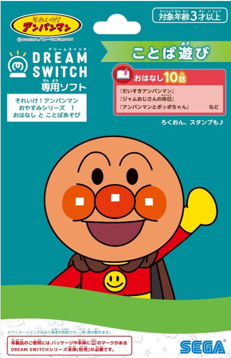セガフェイブのDREAM SWITCH専用ソフト「それいけ!アンパンマン おやすみシリーズ1 おはなしとことばあそび」は、寝かしつけと知育を同時に実現する投影型コンテンツソフトです。発売日は2026年3月26日。対象年齢は3歳以上で、ひらがな理解や語彙発達が始まる幼児期に最適化されています。