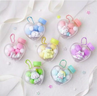 この商品の大きな特徴は、ハート型の瓶型ケースもふもふポンポンがセットになっている点です。ケースは開閉可能で、中に付属のポンポンを入れたり、自分好みの小物を収納したりできます。マスコットはボールチェーン付きのチャーム仕様で、バッグやキーケースに取り付けやすく、普段使いにもぴったり。ポンポンを自由にアレンジしてケース内をデコレーションできるため、コレクションとして飾るだけでなく、カスタマイズして楽しむ実用性の高さも魅力です。