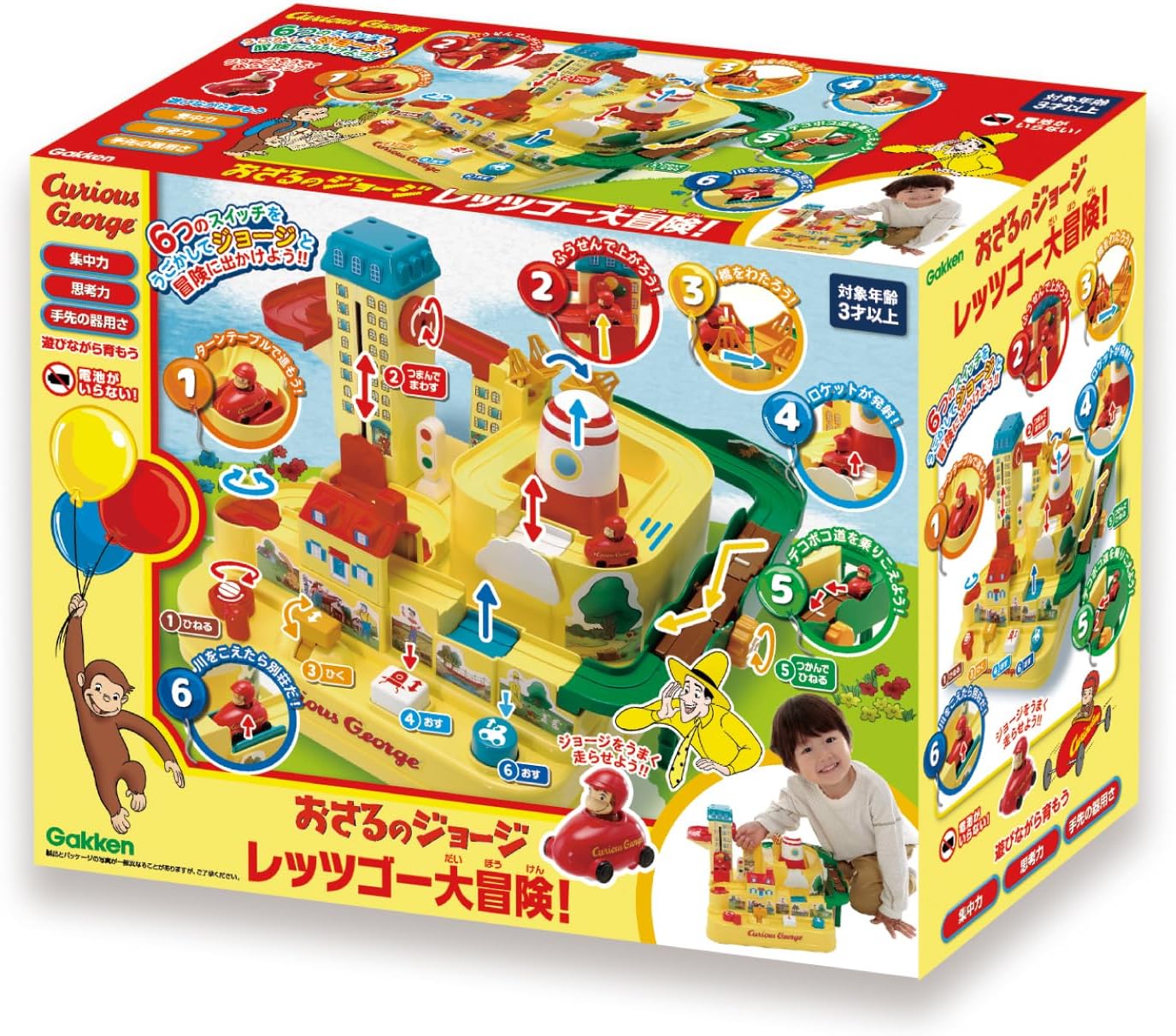 2025年10月24日に学研から発売される「おさるのジョージ レッツゴー大冒険!」(品番:83802)は、対象年齢3歳以上の知育玩具です。電池不要で、価格は税込8,778円前後(店舗により異なる見込み)。ジョージが住む街から別荘のカントリーまでを舞台に、レバーやボタンなどの操作で冒険を楽しむ構成となっています。