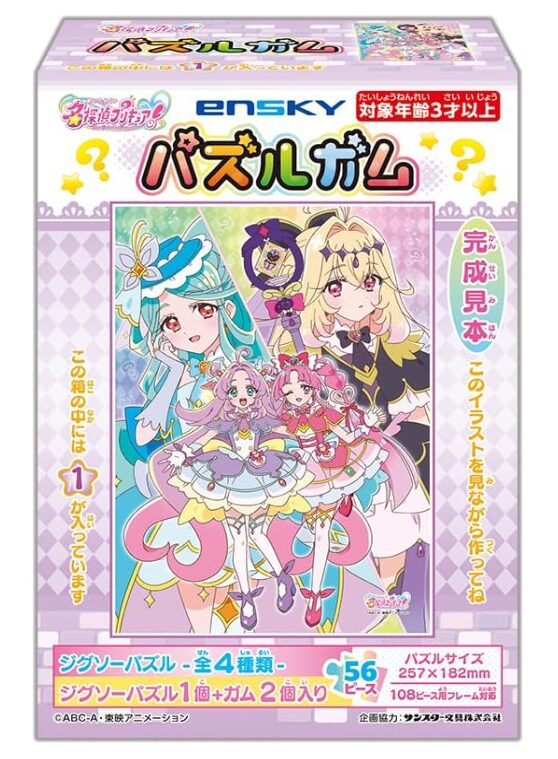 「名探偵プリキュア! パズルガム」は、エンスカイより2026年3月18日に発売されるジグソーパズル付き食玩です。1BOXは8個入りで構成され、1個につき「56ピースジグソーパズル1枚+粒ガム(イチゴ味)2個」が封入されています。
