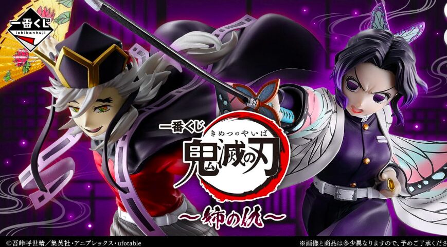 くじテーマは、胡蝶しのぶと上弦の弐・童磨の死闘を中心に据えた「姉の仇」。作中でも強烈な印象を残したこの対決を、立体フィギュアとグッズで再現しています。