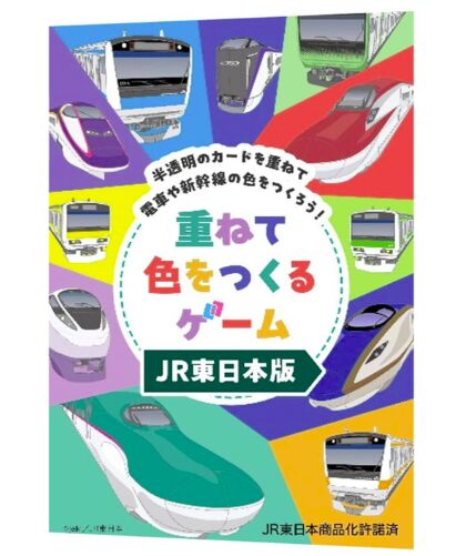 「重ねて色をつくるゲーム JR東日本版」は、透明カードを重ねて色を作るという独自の仕組みと、JR東日本の実在車両をモチーフにしたお題カードが融合した、知育にも遊びにも優れたボードゲームです。色の三原色(CMYK)を実際に重ねて試しながら、子どもは直感的に、大人は理論的に楽しめる奥深さがあり、年齢問わず長く遊べます。
