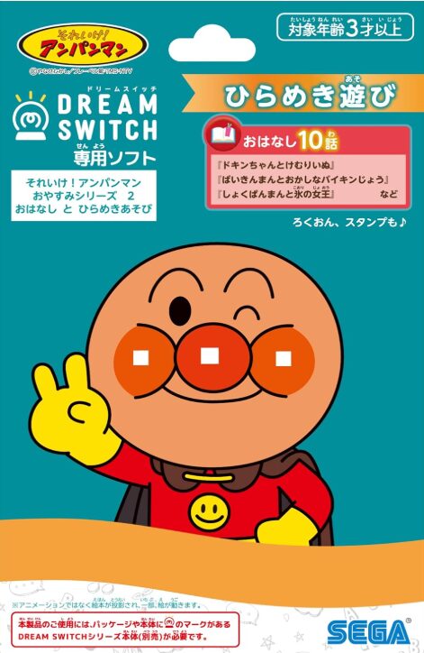 「それいけ!アンパンマン おやすみシリーズ2 おはなしとひらめきあそび」は、セガフェイブの天井投影型読み聞かせデバイスDREAM SWITCH専用ソフトとして2026年4月23日に発売される知育・寝かしつけ支援コンテンツです。対象年齢は3歳以上。ひらがな理解・語彙発達・想像力が伸び始める幼児期に最適化されています。