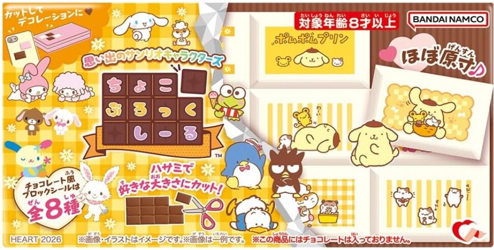 2026年3月29日にハートから発売される「ちょこぶろっくしーる 思い出のサンリオキャラクターズ」は、板チョコデザインのブロック型シールが特徴の人気シリーズ第二弾です。BOXには8個入りで、全8種のシートがランダム封入されています。各シートには12柄のミニデザインが収録されているため、開封するたびにワクワクするコレクション系食玩として高い注目を集めています。
