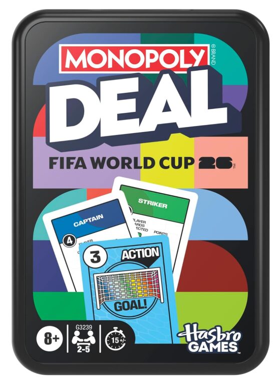 FIFAテーマが採用されており、サッカーファンにとってはデザイン面でも魅力的。ボード版の“資産形成”要素を凝縮しつつ、カードによる攻防を中心に再構築されています。持ち運びもしやすく、旅行や外出先でも遊びやすいライト寄りのモノポリー作品です。