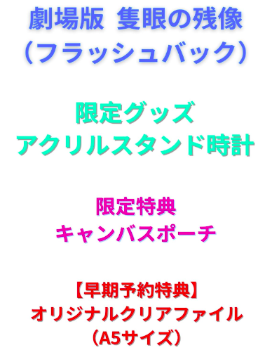 「劇場版 隻眼の残像(フラッシュバック)」のパッケージメディアは、2025年11月26日にBlu-ray/DVDで同時発売されます。特に注目は【限定:アクリルスタンド時計付き豪華盤】で、豪華盤の基本構成に加え、限定グッズが多数同梱されたスペシャル仕様です。