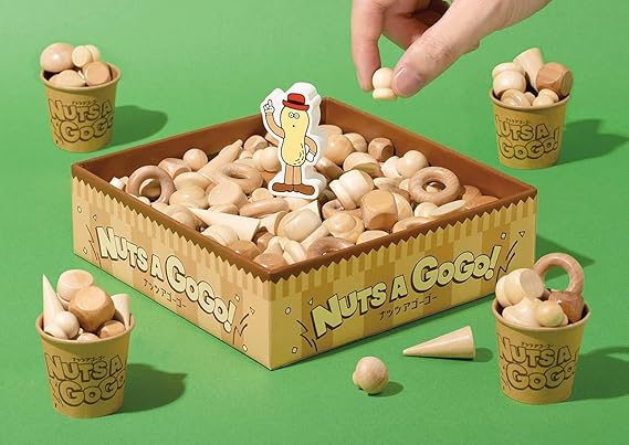 ナッツアゴーゴーは、木製のナッツ型コマをカップに詰め込み、同じ形を出し合って最後まで耐え抜いた人が勝つ、シンプルかつ直感的なアクションゲームです。