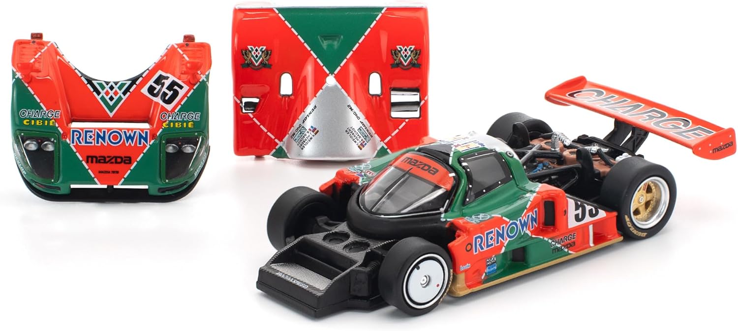 塗装はマツダ787Bの象徴ともいえるグリーン×オレンジの「チャージカラー」を忠実に再現。発色やツヤ感は実車を参考にした調整がなされ、ミニカーとしての存在感を一層高めています。