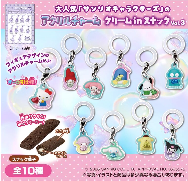 サンリオキャラクターズ アクリルチャーム クリームinスナック Vol.3 BOX(タカラトミーアーツ)は、お菓子と可愛いアクリルチャームがセットになった人気の食玩シリーズ最新作です。1BOX10個入りで全10種が揃うコンプリート仕様となっており、コレクターにも嬉しい設計。付属するチャームは、ガチャでも人気の「きらめき★バルーンフィギュア」デザインを採用し、透明感と華やかさが魅力です。カニカン&シリコンリング付きで実用性も高く、バッグやポーチに簡単に装着可能。子どもから大人まで楽しめる、サンリオファン必見の注目アイテムです。