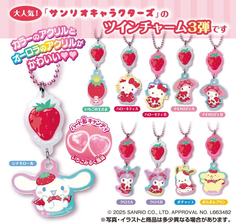 2025年12月10日、タカラトミーアーツから「サンリオキャラクターズ ツインチャーム はーとキャンディ いちごみるく風味」が登場します。本商品は、アクリルチャームとキャンディがセットになった食玩で、BOX販売(10個セット)では 全10種コンプリート確定 という安心仕様。チャームは「いちご新聞50周年記念アート」をモチーフにした描き下ろしで、サンリオファンにとって特別感の高いアイテムとなっています。付属のキャンディはハート形のいちごみるく風味で、可愛いだけでなく味わいもしっかり楽しめます。