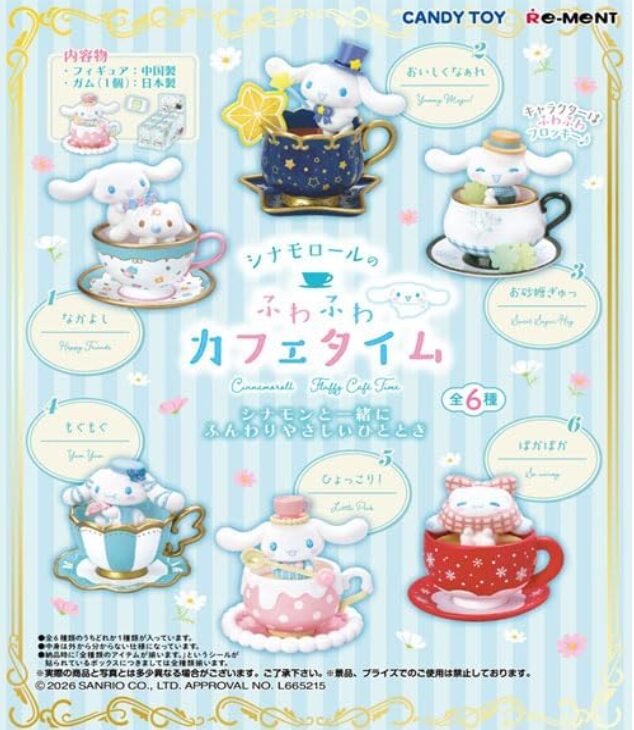 「シナモロールのふわふわカフェタイム」は、フロッキー仕様のふわふわフィギュアがティーカップに入った癒し系食玩です。全6種が1BOXで揃う安心設計に加え、見た目の可愛さと触り心地の良さで満足度は非常に高め。カフェテーマのミニチュア感も魅力で、デスクや棚に飾るだけで可愛い空間が完成します。本記事ではラインナップ・コスパ・注意点・売り切れリスクまで徹底解説。購入を迷っている方は、在庫があるうちにチェックしておきましょう。