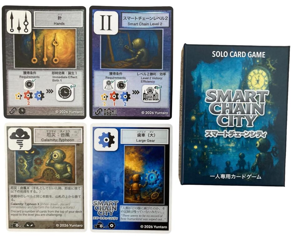 スマートチェーンシティは、短時間で濃密な思考体験ができる完成度の高いソロカードゲームです。独自の歯車システムが戦略性を大きく高めています。