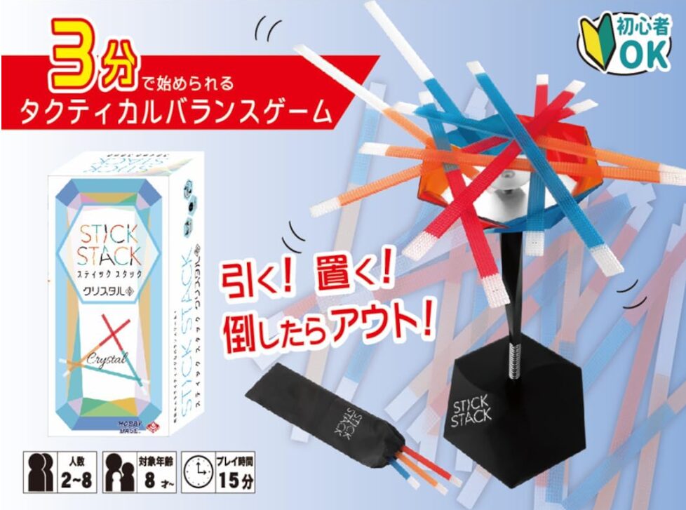 本作の最大の特徴は、従来のスティックゲームとは一線を画す“透明クリスタルスティック”の美しさです。光を透かすようにデザインされたスティックは、積み上げるほどに立体的なアート作品のようにも見え、視覚的な楽しさをプラスします。単にゲームとして面白いだけでなく、プレイ中の見た目がとても華やかになるため、大人数でのパーティーや家族時間をより盛り上げてくれます。