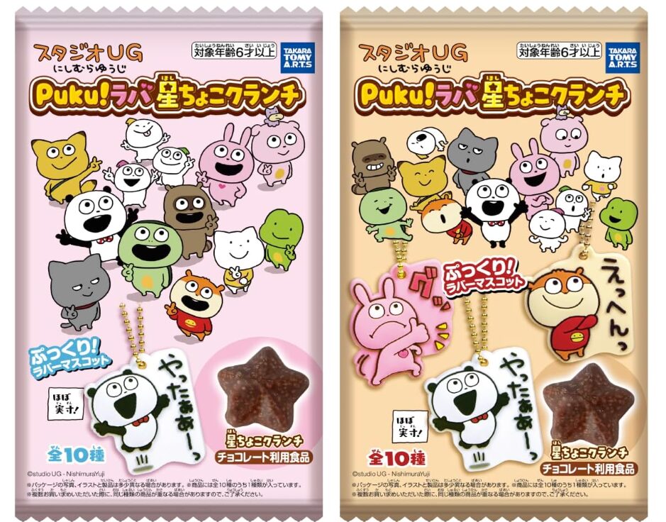 「スタジオUG Puku!ラバ 星ちょこクランチ」は、タカラトミーアーツが展開する人気キャラクターシリーズ「スタジオUG」を題材にした食玩商品です。最大の特徴は、セリフ入りスタンプデザインのラバーマスコットと星型チョコクランチがセットになっている点にあります。