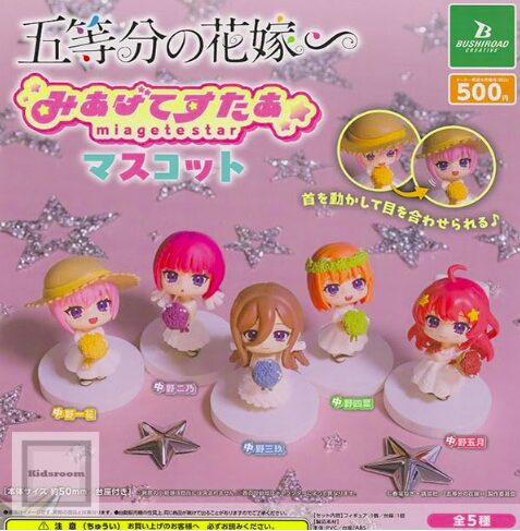 「みあげてすたぁコレクション」は、五等分の花嫁∽をテーマとしたガチャフィギュアシリーズで、コンパクトながら存在感のあるデフォルメ造形が魅力です。サイズは掌に乗る小型フィギュアながら、髪の動き、色味、表情のニュアンスなど、キャラクターごとの“らしさ”をしっかり再現しています。