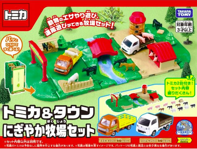 スズキ キャリイとスバル サンバーの牧場トラックに動物を載せて遊べるほか、トミカタウンやどうろセットとの拡張も可能。